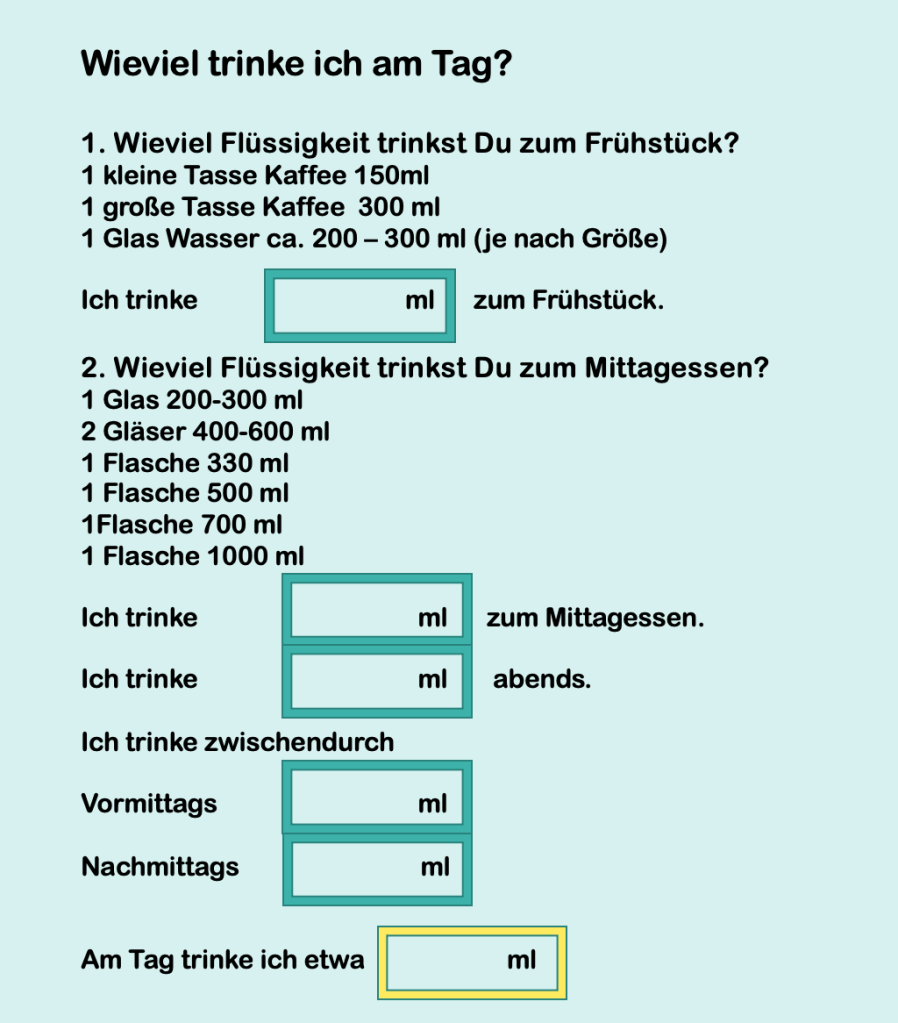 - Dann trinken, wenn wir Durst haben, dabei kann die Menge auch einmal etwas von den Normwerten abweichen.